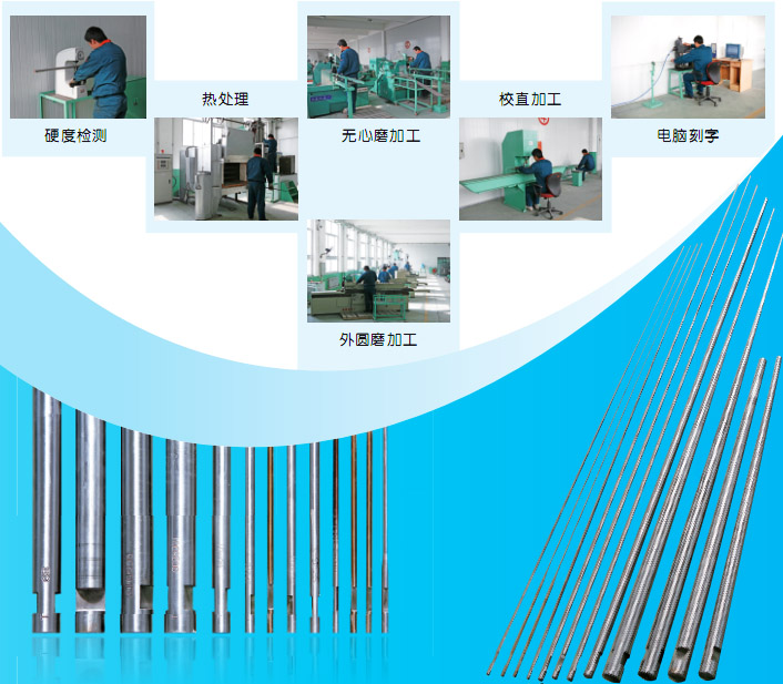 我廠以先進的生產(chǎn)工藝配套生產(chǎn)漁竿、高爾夫球桿、登山杖、滑雪桿、箭桿等一系列模具,我們以嚴格的檢驗流程,用先進的檢測設(shè)備,來控制每支合格產(chǎn)品的出廠。所產(chǎn)模具技術(shù)要求均保證到:表面硬度HRC42—52(可按客戶要求定),表面粗糙度 ,徑向公差均為±0.015mm,直線度0.10mm/1000mm 以內(nèi)。